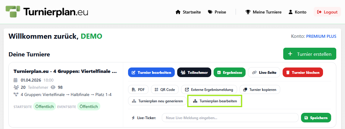 Den Spiele- und Turnierplan Editor findest du im "Mein Turniere" Bereich unter dem Link-Button Turnierplan bearbeiten.