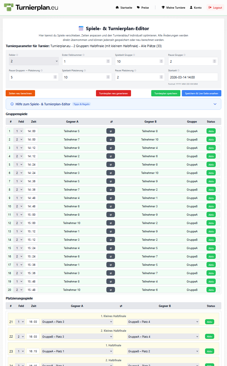 Nach dem Erstellen des Turniers kannst du, mit Premium Paket, den Spielplan flexibel anpassen. Dazu gehören Startzeiten, Reihenfolgen, Spielfelder und in vielen Fällen auch Paarungen.