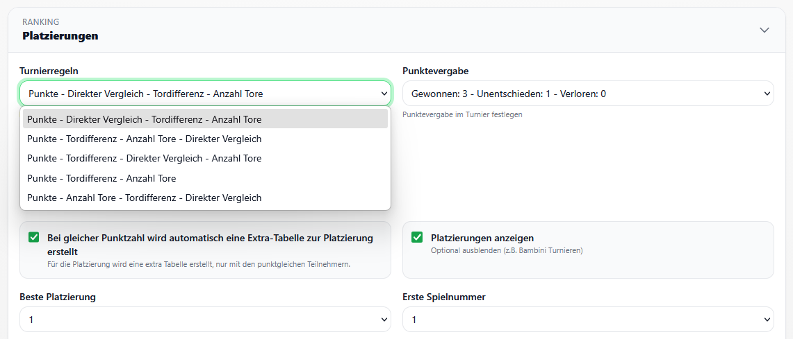 Unter dem Reiter "Platzierungen" bei der Turniererstellung können Sie Turnierregeln für die Platzierung bei Gruppenspielen festlegen.