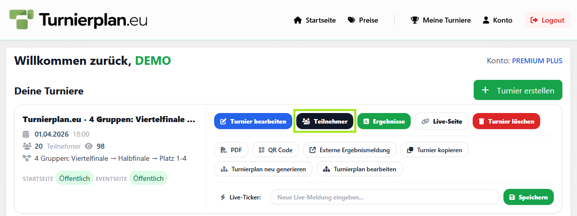 Hierzu kannst du den Link-Button Teilnehmer im "Mein Turniere" Bereich nutzen.