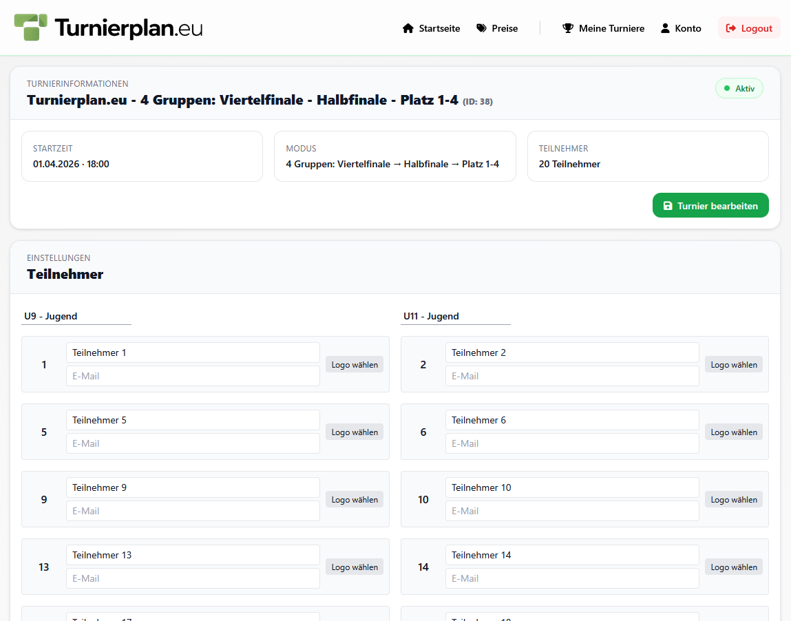Du kannst in dieser Maske einfach die Teilnehmer austauschen oder die Namen korrigieren, E-Mail Adressen oder Logos ändern. Einfach unten auf "Speichern" klicken und die Änderungen sind aktiv. Sie müssen den Turnierplan nicht neu generieren lassen.