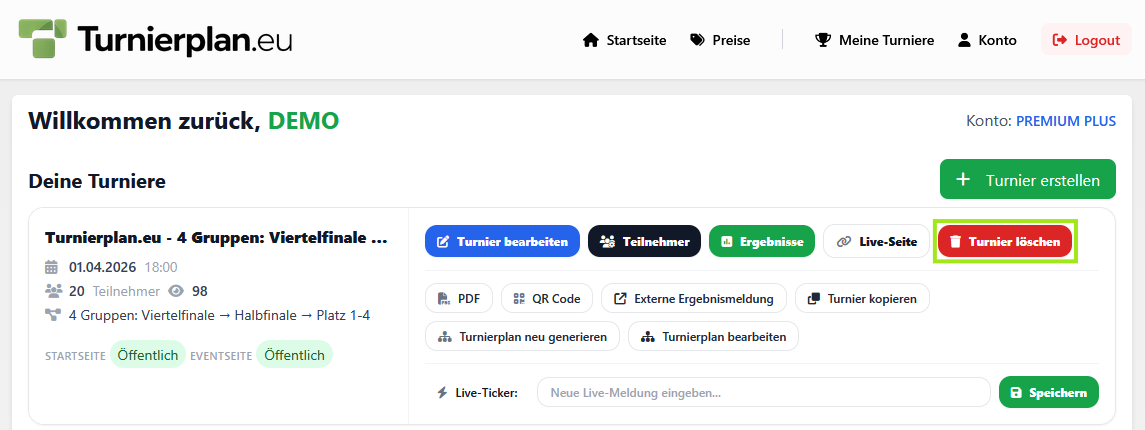 Nicht mehr benötigte Turniere können gelöscht oder zur späteren Einsicht archiviert werden. Die Archivierungsfunktion ist erst ab Version 1.0.1 und nur für Premium Pakete verfügbar.