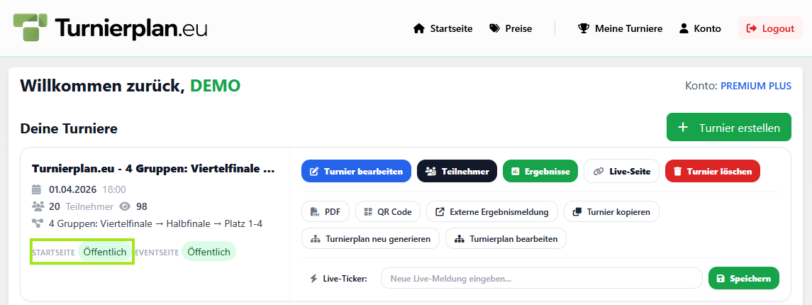 So machst du dein Turnier öffentlich sichtbar und teilst es mit Teilnehmern und Zuschauern.